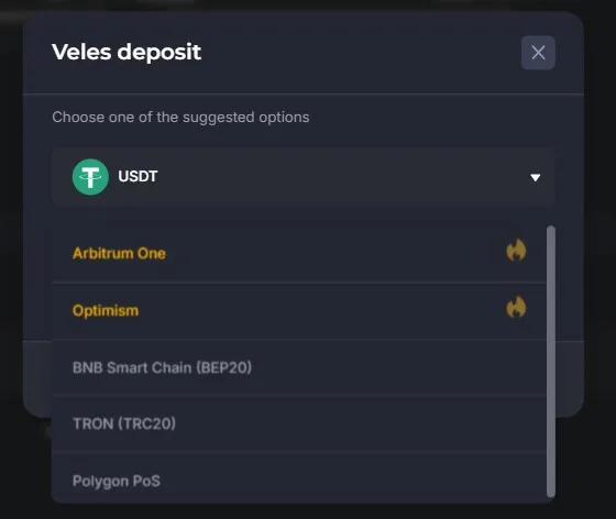 For example, multiple blockchains can be used to fund an account on the Veles platform. For example, the popular USDT token can be sent to your account through the BNB Smart Chain and TRON blockchains, as well as through the second-level networks (add-ons on top of the Ethereum blockchain): Arbitrum, Optimism and Polygon.