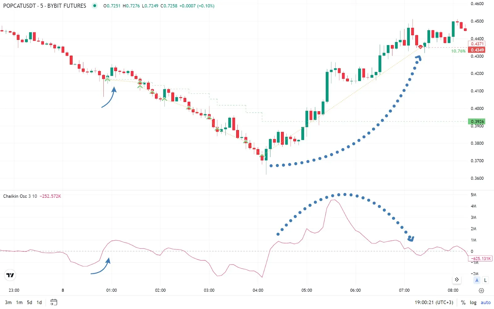 Description: The Chaikin Oscillator (CHO) is a tool that takes into account not only price changes, but also shows how fast volume changes. If the volume grows on LONG candles, the fast moving average starts to move faster relative to the slow moving average, and the oscillator line goes up. Conversely, if the volume grows on SHORT candlesticks, the indicator line moves downward.