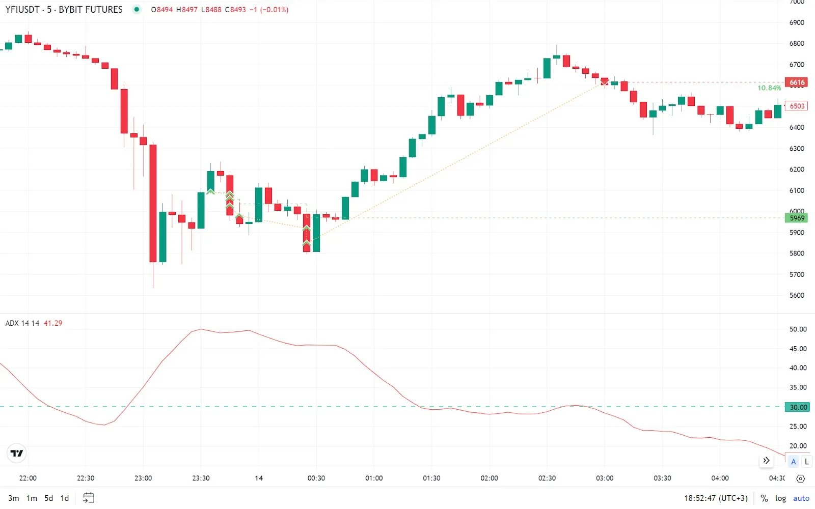 Application in the strategy: We use the ADX indicator with a value of more than 35 on a time frame of 5 minutes. This allows us to catch powerful short-term impulses.