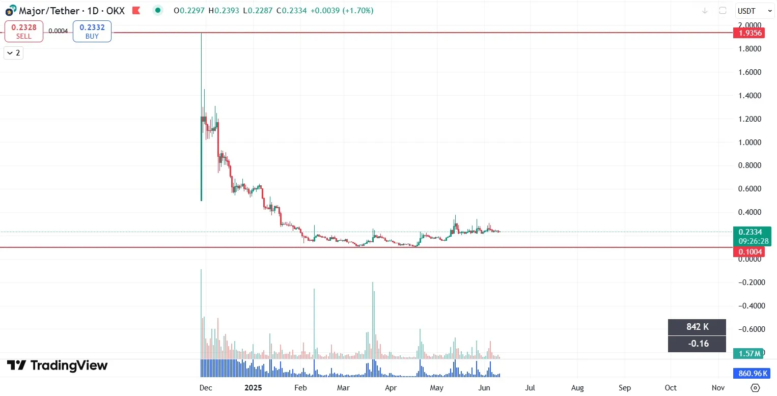 The token was listed on exchanges on November 28, 2024. More than half a year has passed since then, but the token has never shown positive dynamics. ATN (all time high) is almost $2, and ATL (all time low) is $0.1. After a prolonged downtrend, the coin found support around 10 cents, bouncing off this price three times. At the moment, $MAJOR is in a one-month accumulation inside the price range of $0.2-0.4$. Technically, this situation looks like a potential correction after a strong dump, but this is only a forecast based on the price chart. It is impossible to know in advance how the participants in the coin (holders) will behave when the correction to either side starts. The crypto market 2025 may surprise, so you should watch for announcements from the project team, which may give the coin life due to positive news background.