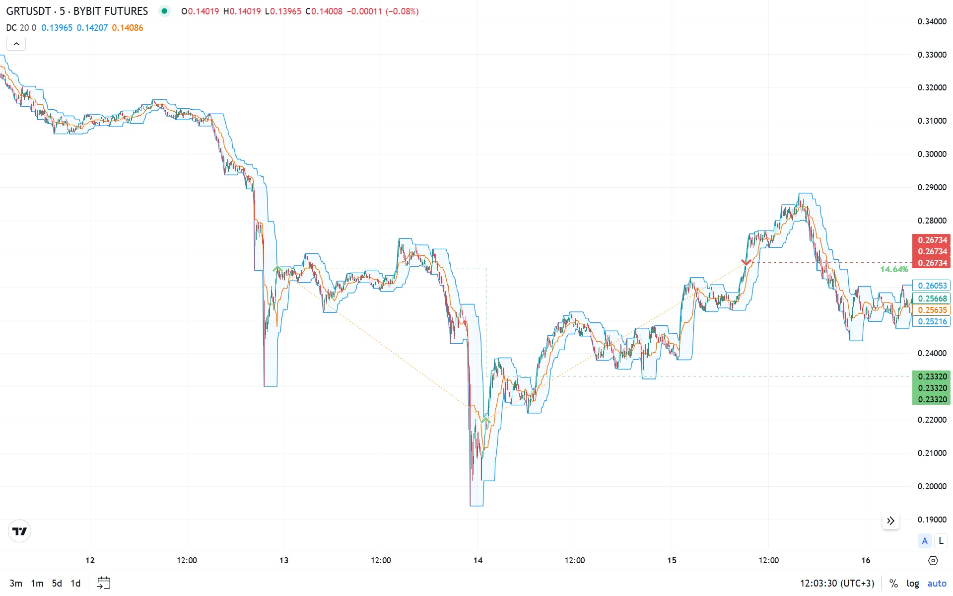 - On the 5-minute timeframe, monitor breakouts of the upper or lower channel boundaries.
