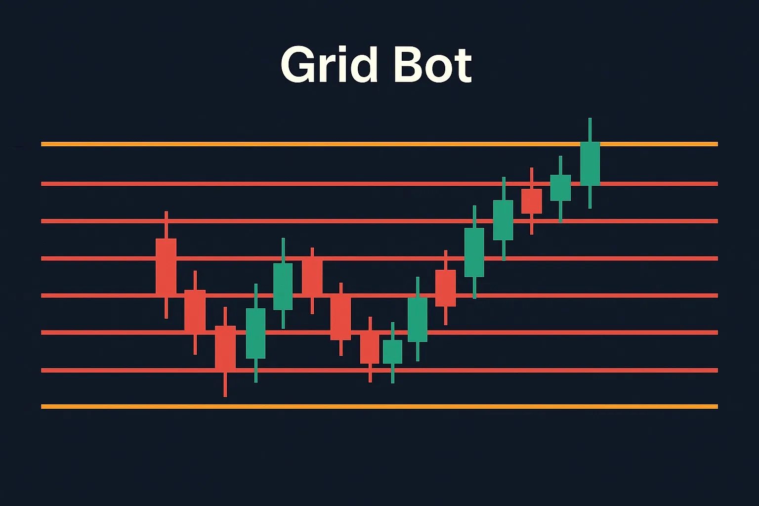 A Grid bot uses a strategy of a grid of limit orders. It places multiple buy and sell orders within a chosen price range. When the price falls, the bot buys; when it rises, it sells. The bot earns on every up-down movement even if there is no trend.