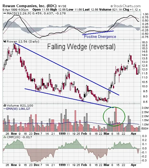 The ability to recognize a descending wedge in real time is one of the main skills of a successful trader. Volume indicators help here: volume decreases when approaching the end of the wedge, and rises sharply at the moment of breakout. This is a classic scenario, which is well tracked by bots that use automatic figure trading.