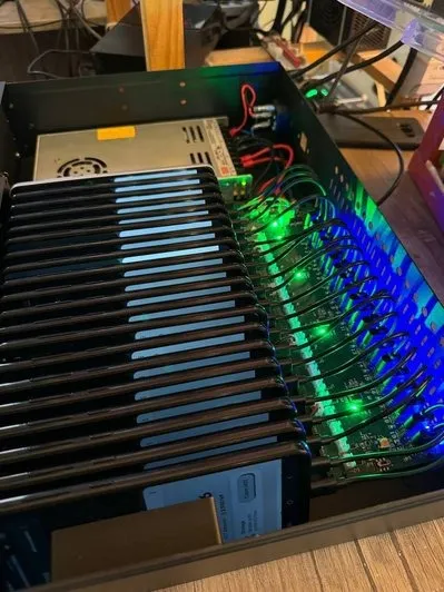 This is how dozens or even more smartphones look like, which work non-stop and perform the necessary activity in the project.