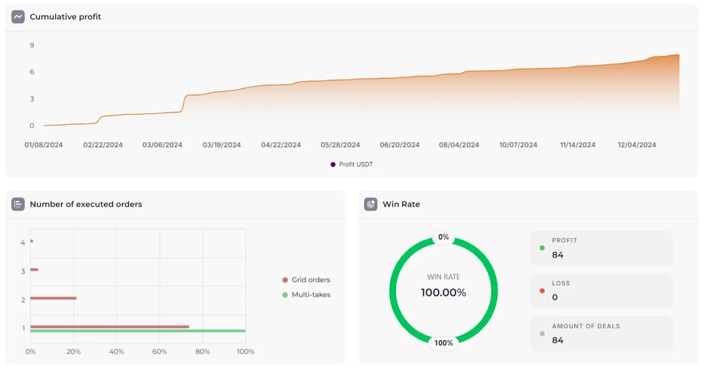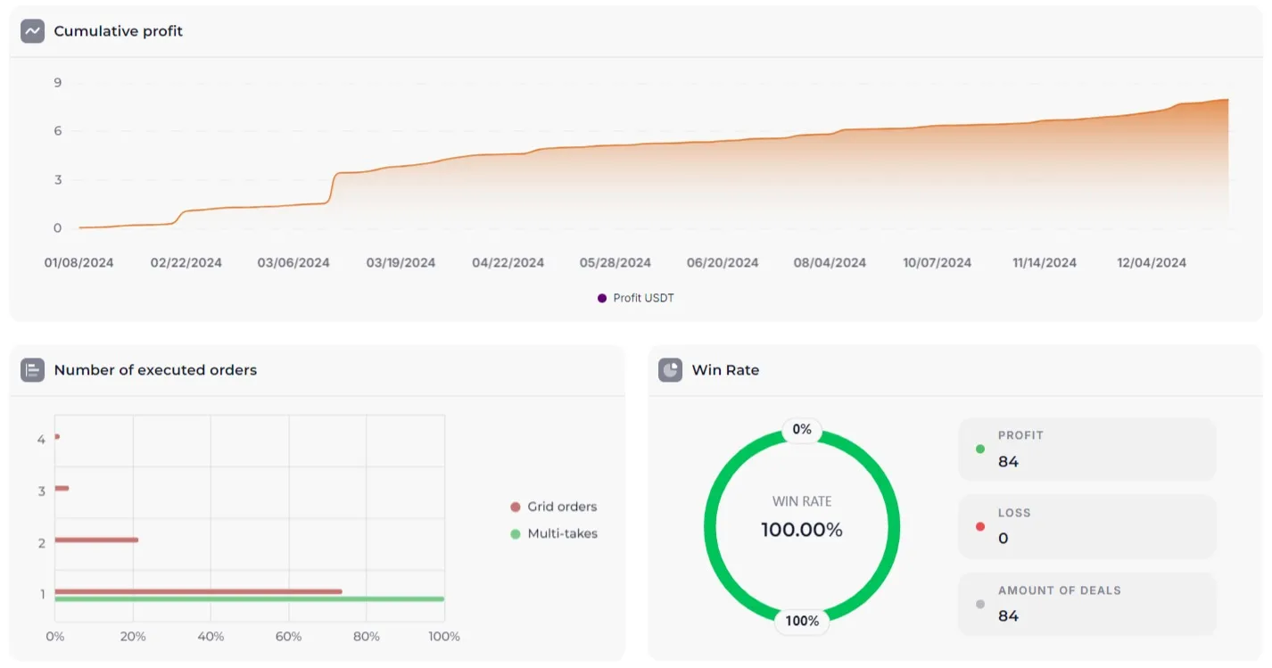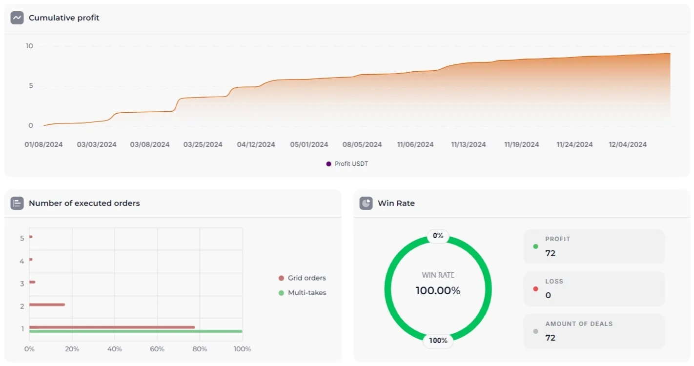 When launching a single bot, it is not recommended to risk more than 1% of the deposit to save your capital.