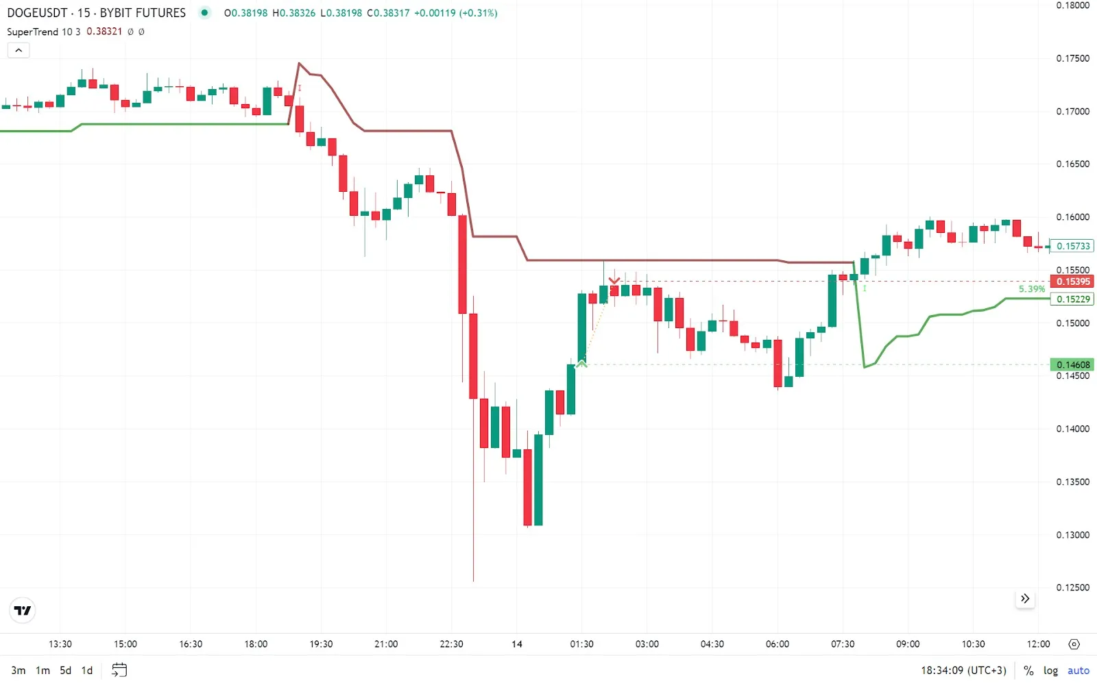 Let’s set the Supertrend indicator (”trend”, reverse signal) on the m15 timeframe.