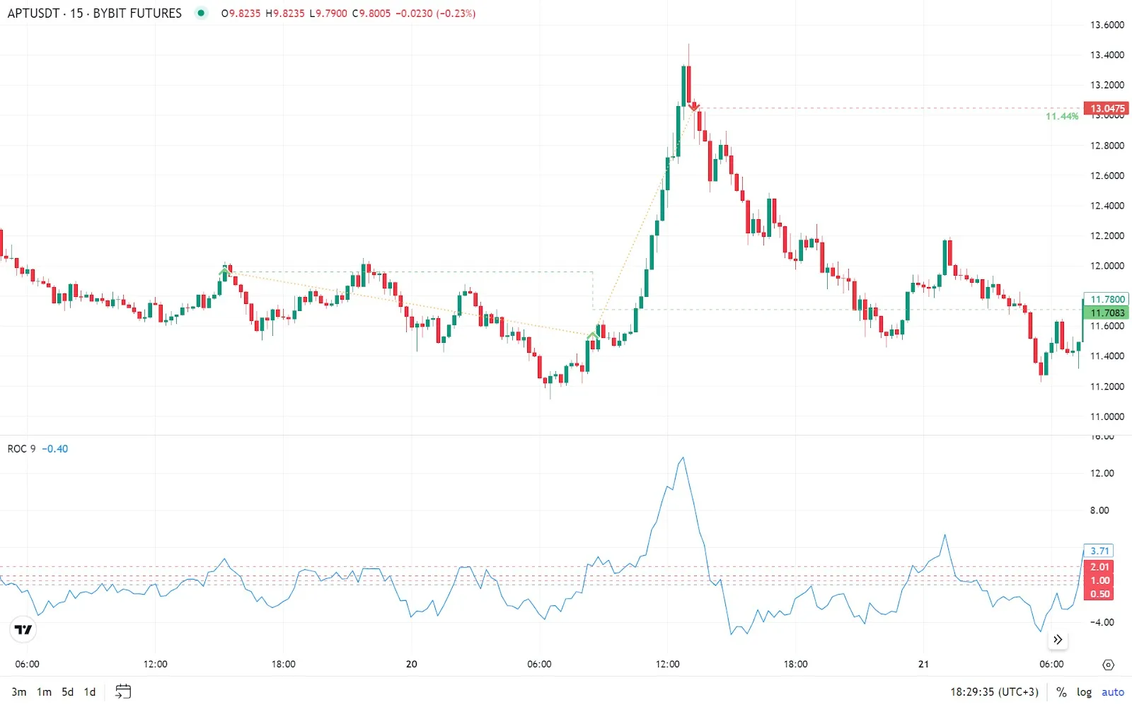 To enter a trade, all three ROC indicators must show positive values. For example: