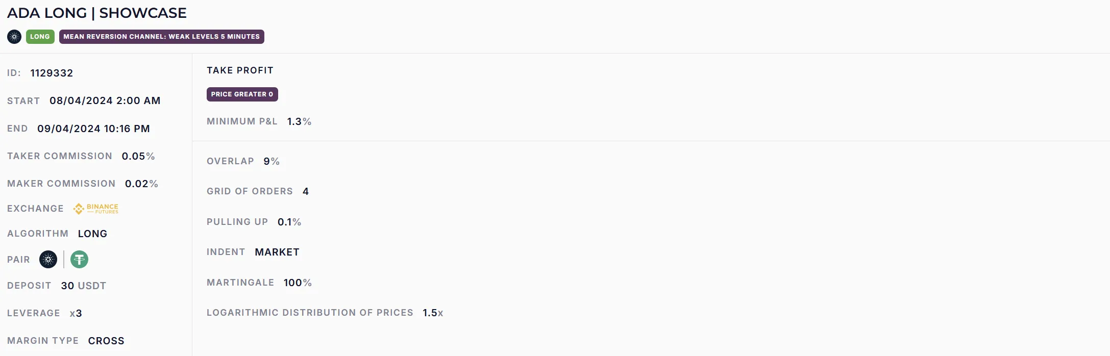 A bot with a well-thought-out mechanics of entering from the price channel, designed for trend trading. Suitable for working with a balance of 300 USDT with 2 leverage.