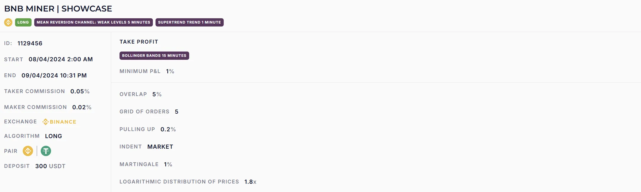 Spot bot for earning BNB to discount commissions on Binance. It has a deposit of 300 USDT for trading. For optional trade averaging you need to have 600 USDT in reserve, which in case of drawdown you need to divide into two independent averages.