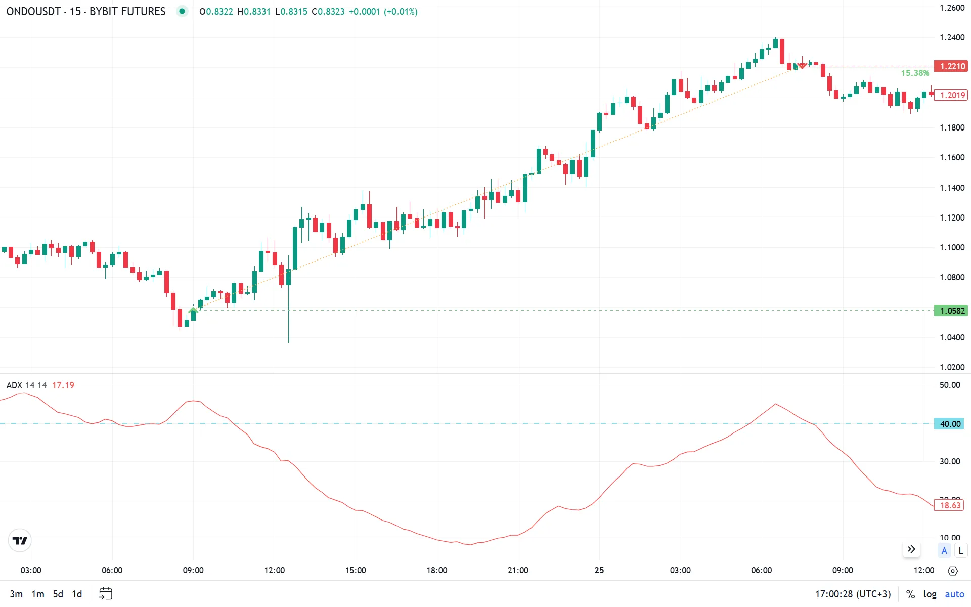 The next indicator is ADX (Average Directional Index) on the 15-minute timeframe (M15). It measures the strength of the trend, helping you understand whether you should enter a trade: