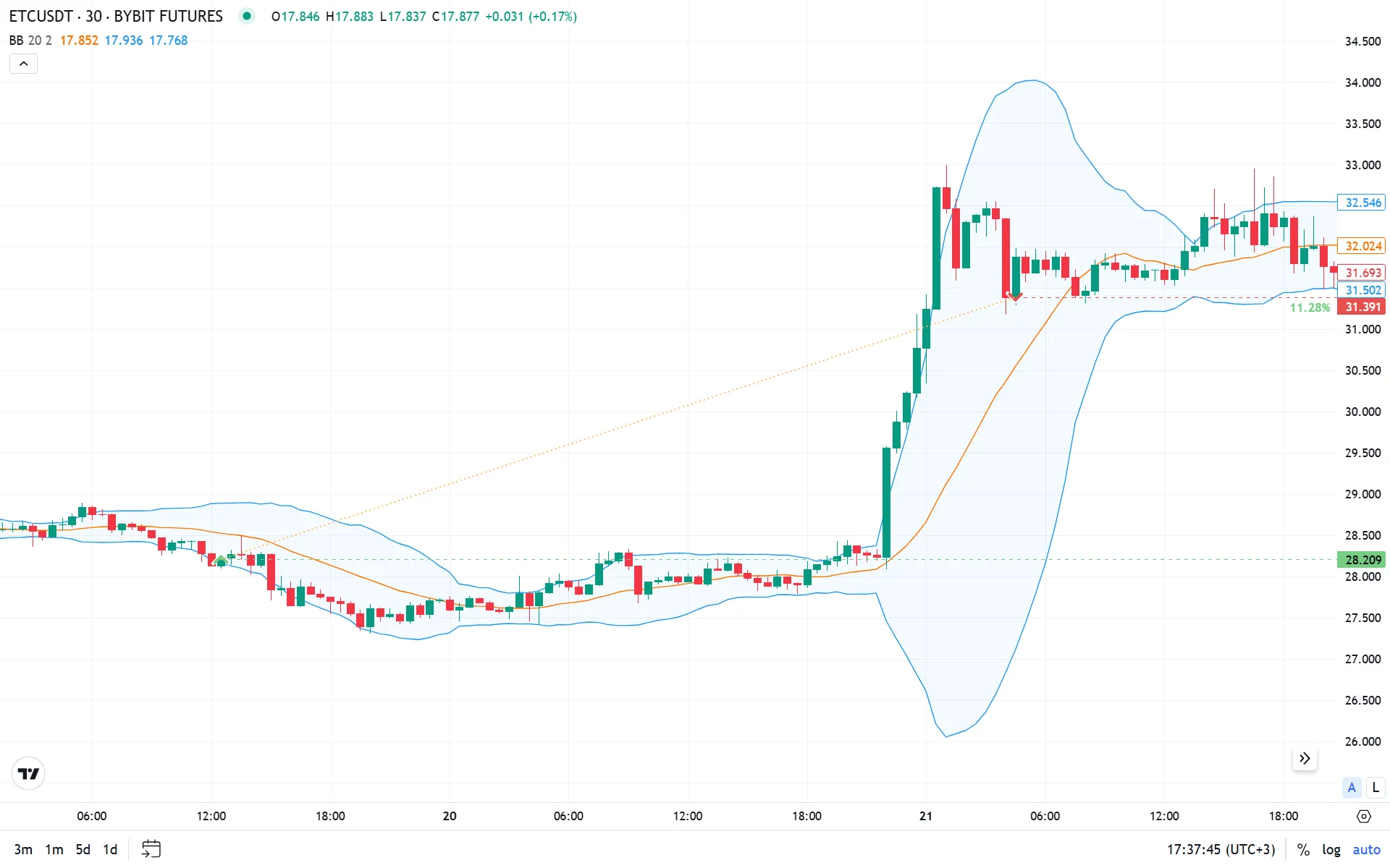 The first reference point is the Bollinger Bands on the 30-minute timeframe (M30). This indicator is based on a moving average and reflects the volatility of the market. The bands show where the price deviates from the norm: