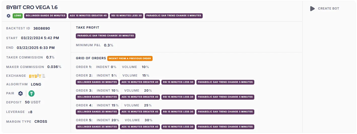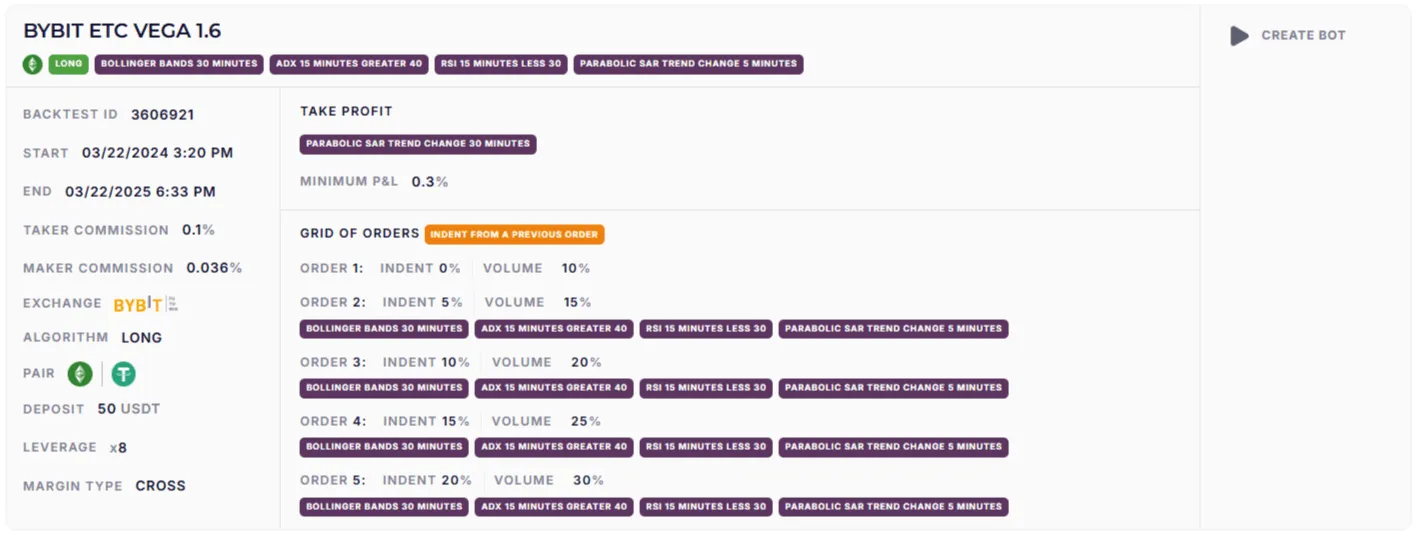 Vega takes care of your capital. To lock in profits, it monitors the crossing of Parabolic SAR points: a change of direction is a reason to close a position. If the market fluctuates, an averaging grid based on RSI and Bollinger Bands is activated. It allows you to buy assets on drawdowns, reducing the average price of the position. This is like insurance for beginners who are not yet used to the sharp turns of the crypto market.