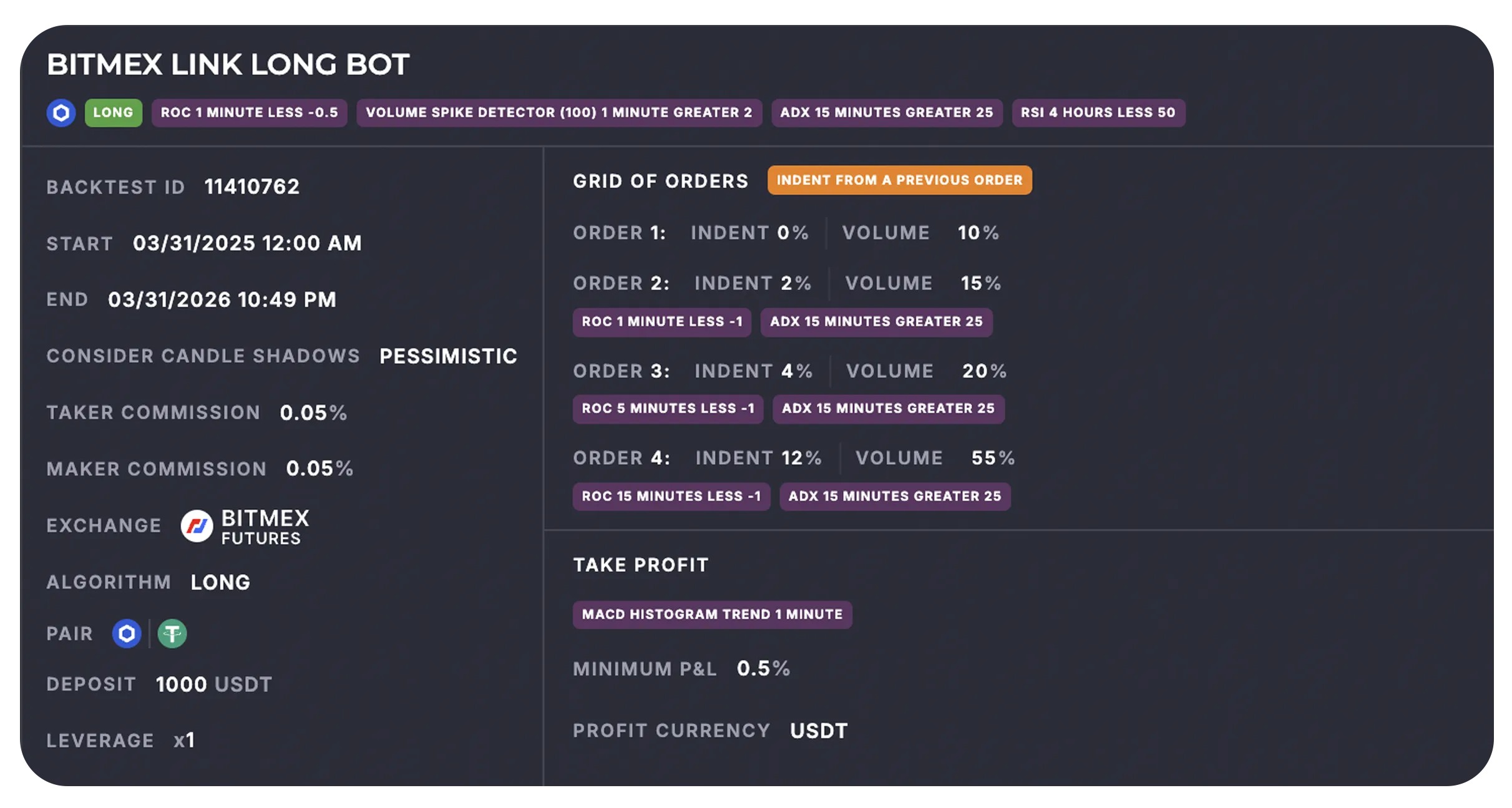 | Bitmex LINK Long Bot | 38.79% | -256.4 USDT/-57.45% | 13 days |