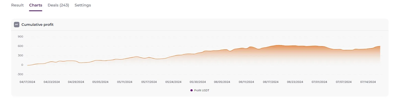 Showing the profitability of the settings on the chart will give insight into whether the bot should be run with the selected settings or whether it is worth making adjustments. You can also evaluate in which time period the trading algorithms were the most profitable and study why this was the case.