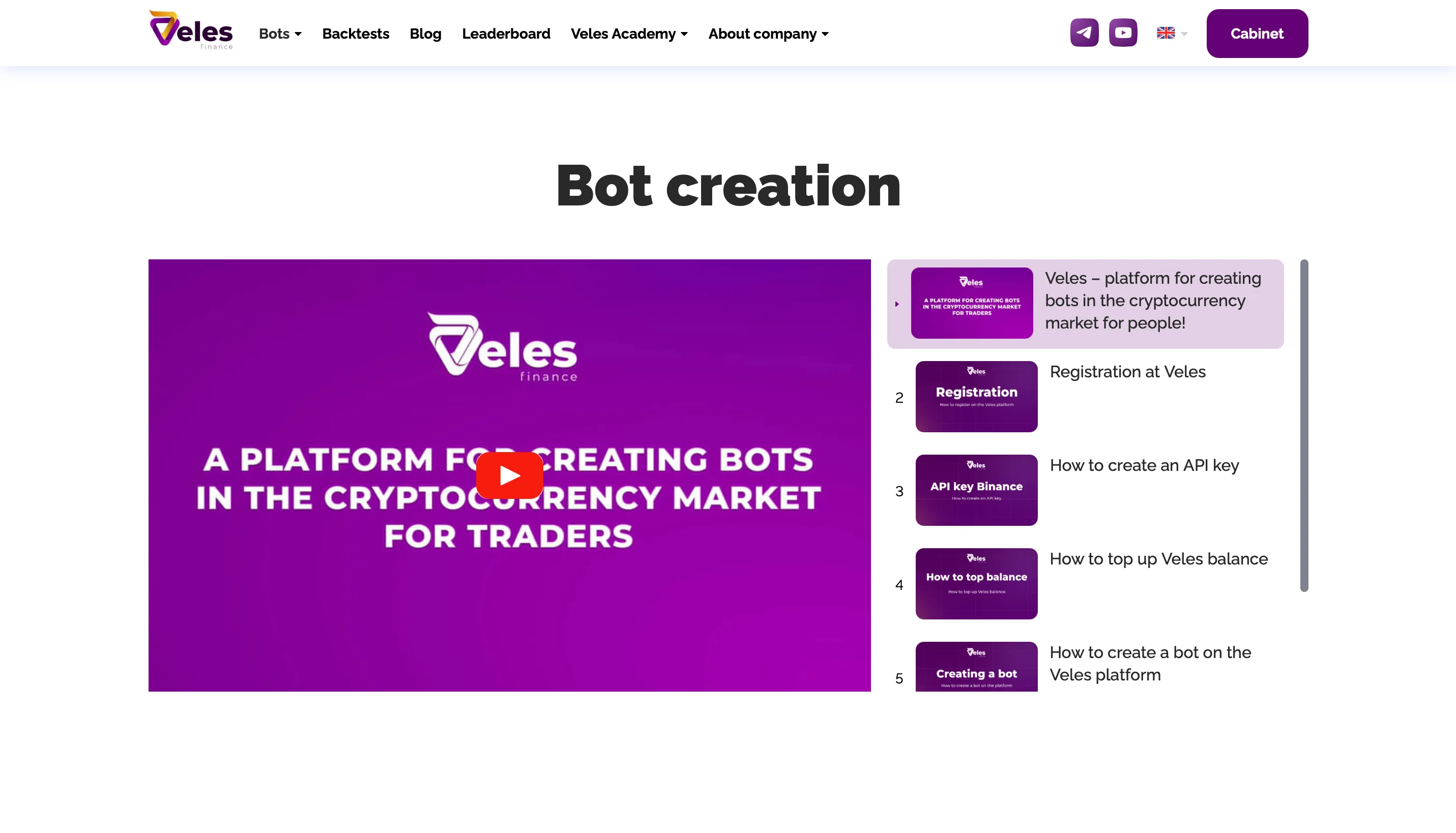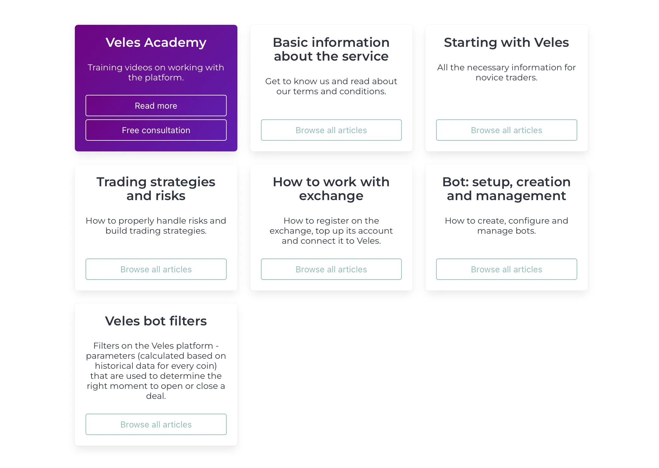 If you want to understand how to effectively use the Veles trading bot, set up a strategy, and manage risks, it’s best to start with Veles Academy — the training section of the platform, which is available on the official Veles website. Here you will find materials to help beginners set up their account and connect to the exchange, create their first bot, understand trading indicators, and learn how to apply professional strategies in practice.
