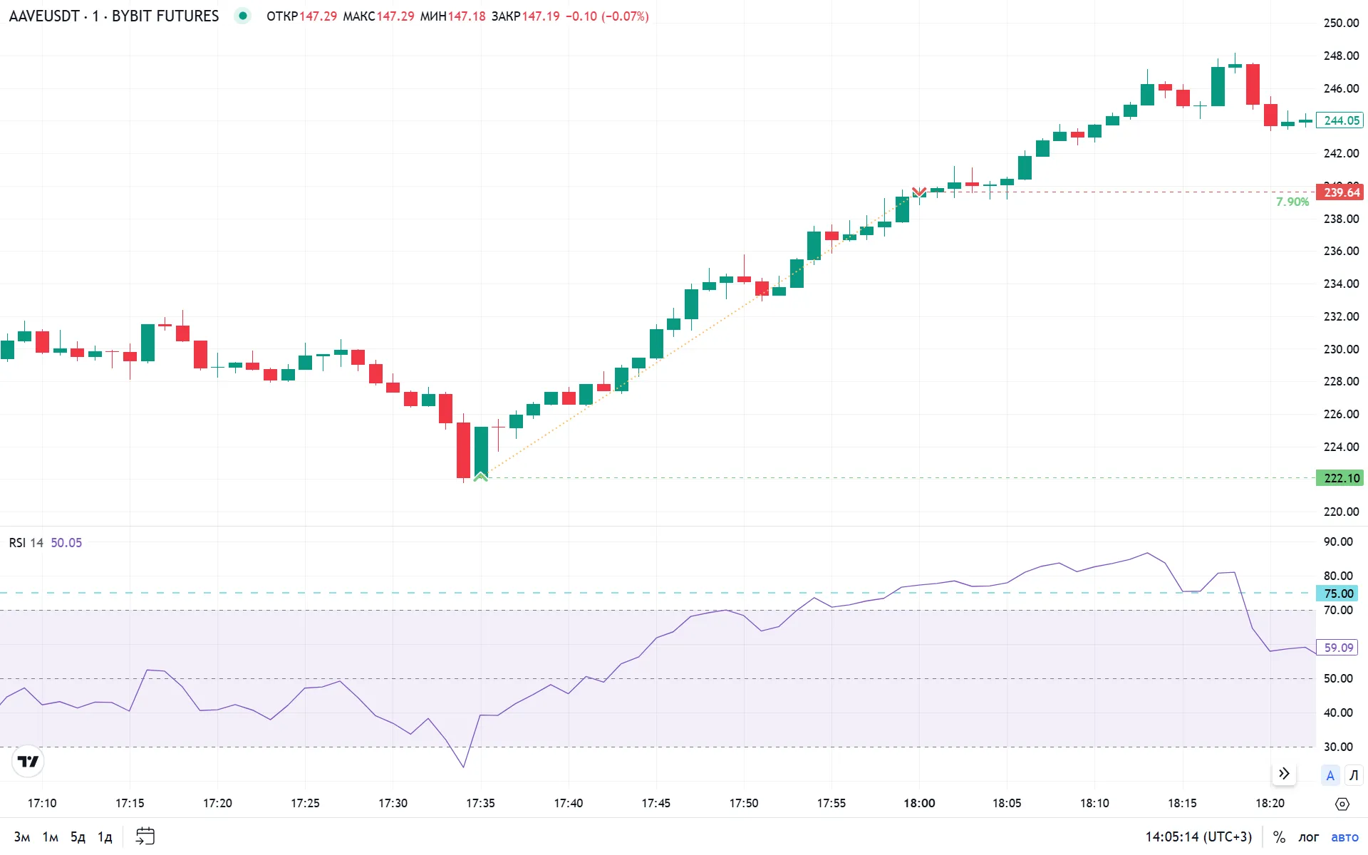 Бот использует RSI на 1-минутном таймфрейме для выхода: если RSI выше 75, он продает AAVE, фиксируя прибыль.