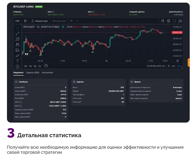 Далее подключается сам бэктест. Например, вы берёте данные по Bitcoin за последние два года и проверяете, как стратегия отработала бы на этом участке. Во время теста система показывает все входы и выходы из сделок. Вы видите, какие сделки были прибыльными, а какие убыточными. Важно обращать внимание не только на общий результат, но и на просадки, количество подряд идущих убыточных сделок, соотношение риска и прибыли. Всё это влияет на итоговую надёжность стратегии.