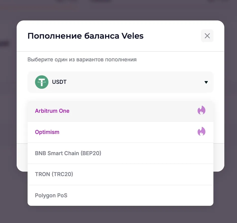 Так, для пополнения баланса счёта на платформе Veles можно использовать несколько блокчейнов. Например, популярный токен USDT можно отправить на свой счёт через блокчейны BNB Smart Chain и TRON, а также через сети второго уровня (надстройки над блокчейном Ethereum): Arbitrum, Optimism и Polygon.