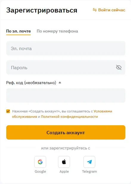 Необходимо ввести свои данные. Биржа предоставляет выбор и можно ввести либо почту, либо номер телефона.
