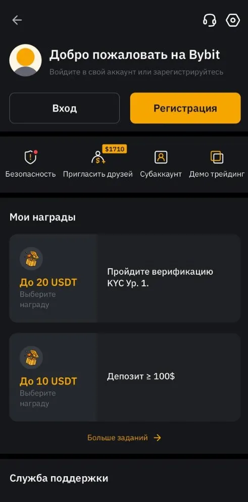 Приветственный бонус: Часто Bybit предлагает бонусы в виде небольших сумм на баланс аккаунта для новых пользователей после регистрации и выполнения первых торговых операций.