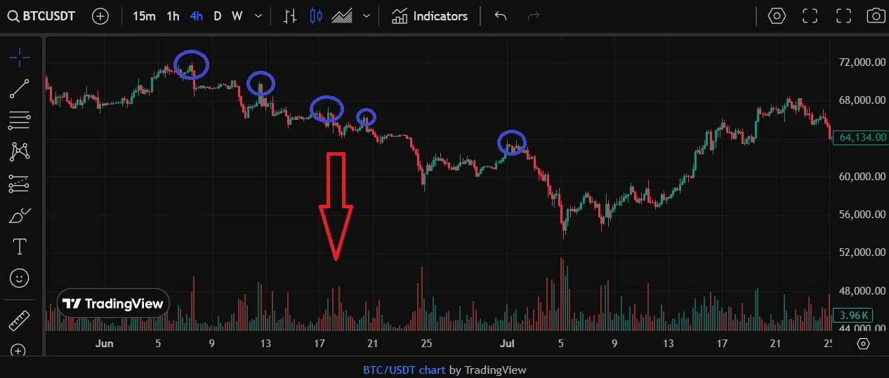 Длинные тени свечей сигнализируют о высокой волатильности, а короткие тела говорят о слабом изменении цены.