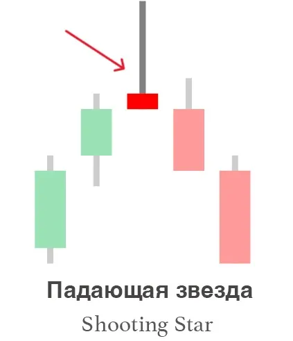 Шутинг Стар (Shooting Star) – свеча с длинной тенью вверху и небольшим телом внизу. Она указывает на слабость бычьего импульса и потенциальный разворот движения вниз.