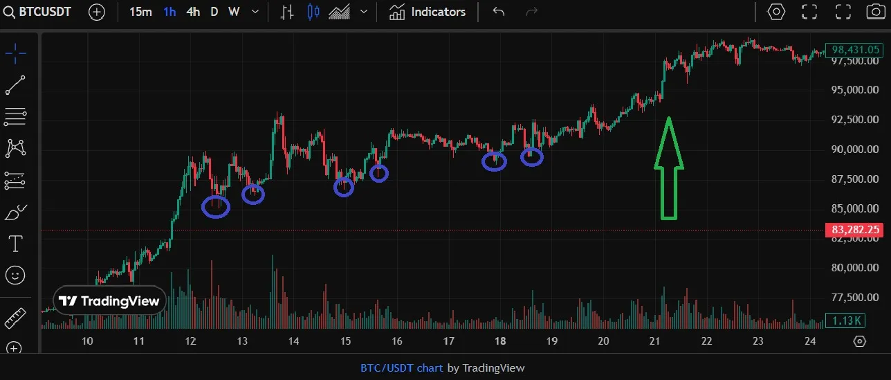 Если Биткоин несколько раз отскакивал от уровня $40,000 и затем сформировал длинную зелёную свечу с высоким объёмом, это может быть сигналом к открытию лонговой позиции.