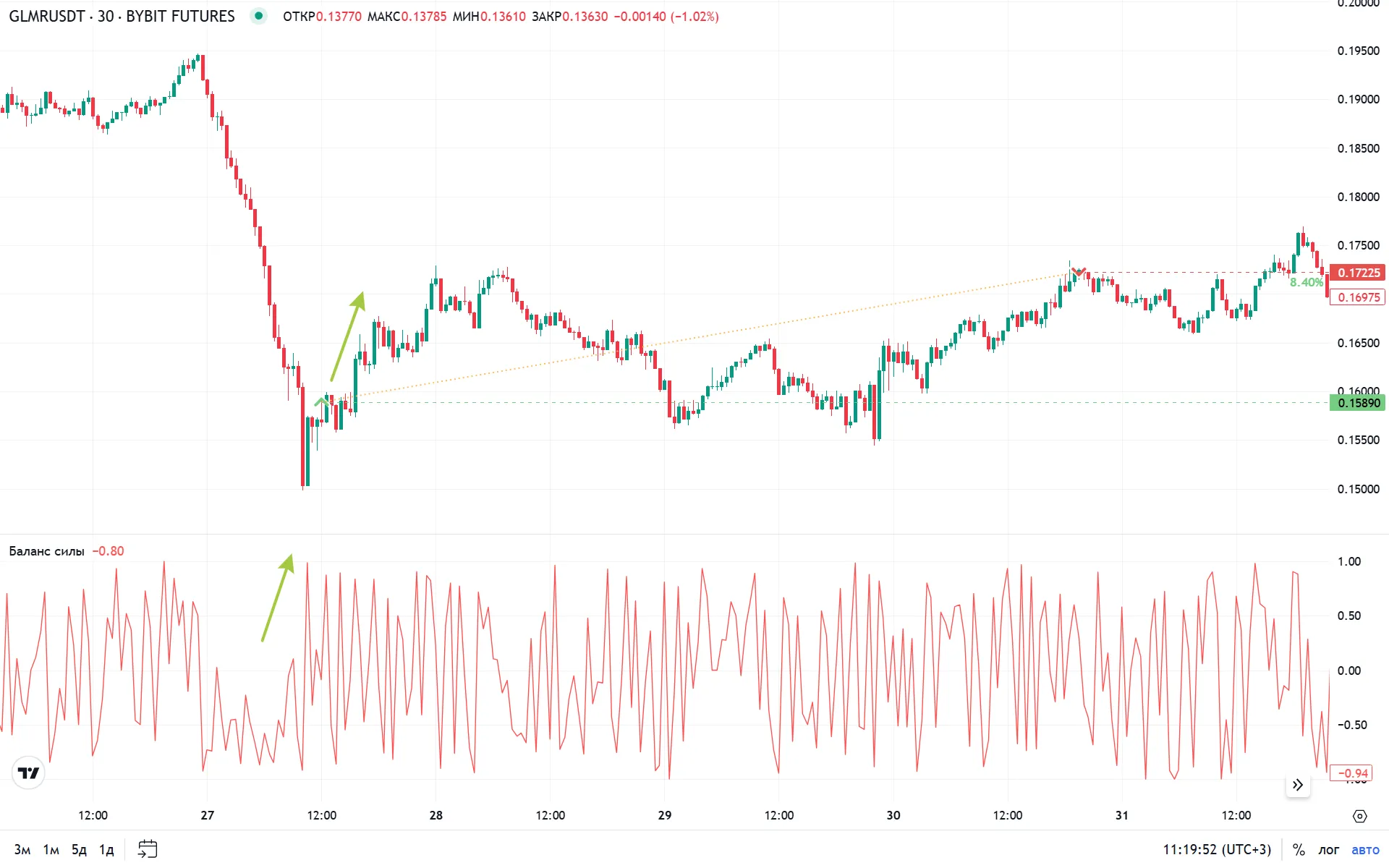 - На таймфрейме M30 (30 минут) отслеживаем моменты, когда BOP показывает давление покупателей.
