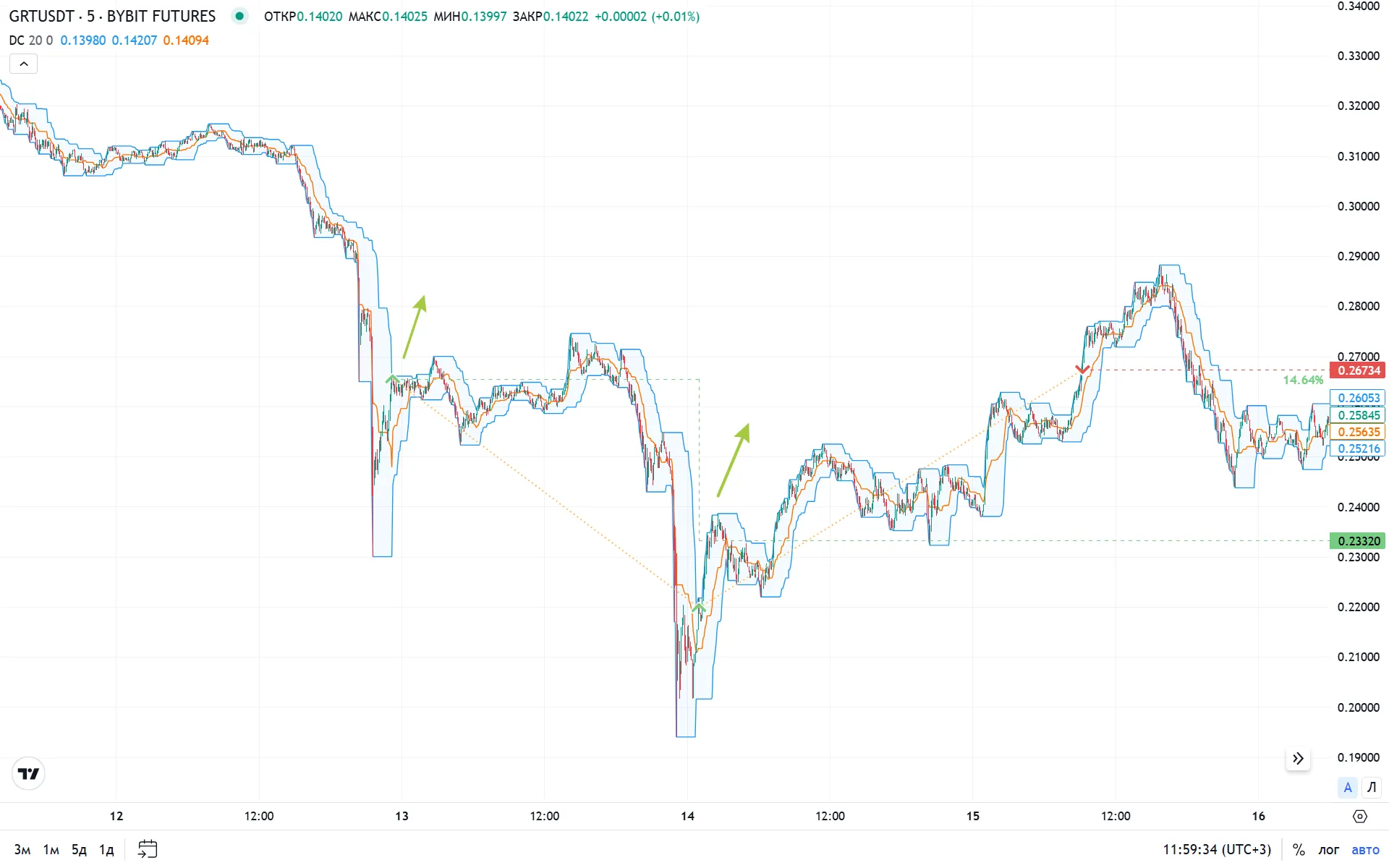 - На 5-минутном таймфрейме отслеживаем прорывы верхней или нижней границы канала.