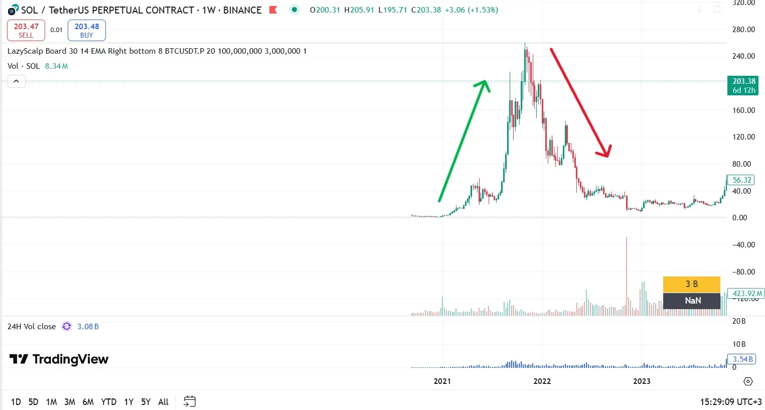 Пример: В BullRun 2021 года ETH вырос с $100 до $4,800, Solana – с $2 до $260.