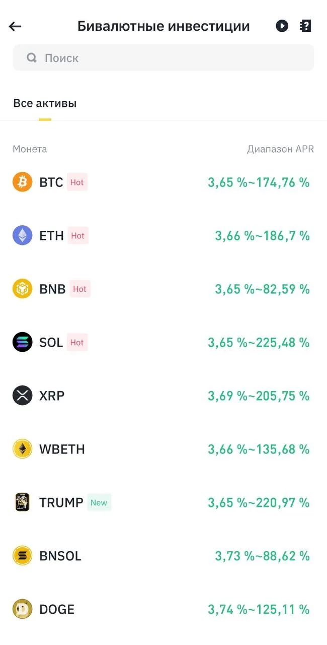Binance предлагает один из самых удобных сервисов для бивалютных инвестиций. Здесь пользователи могут: