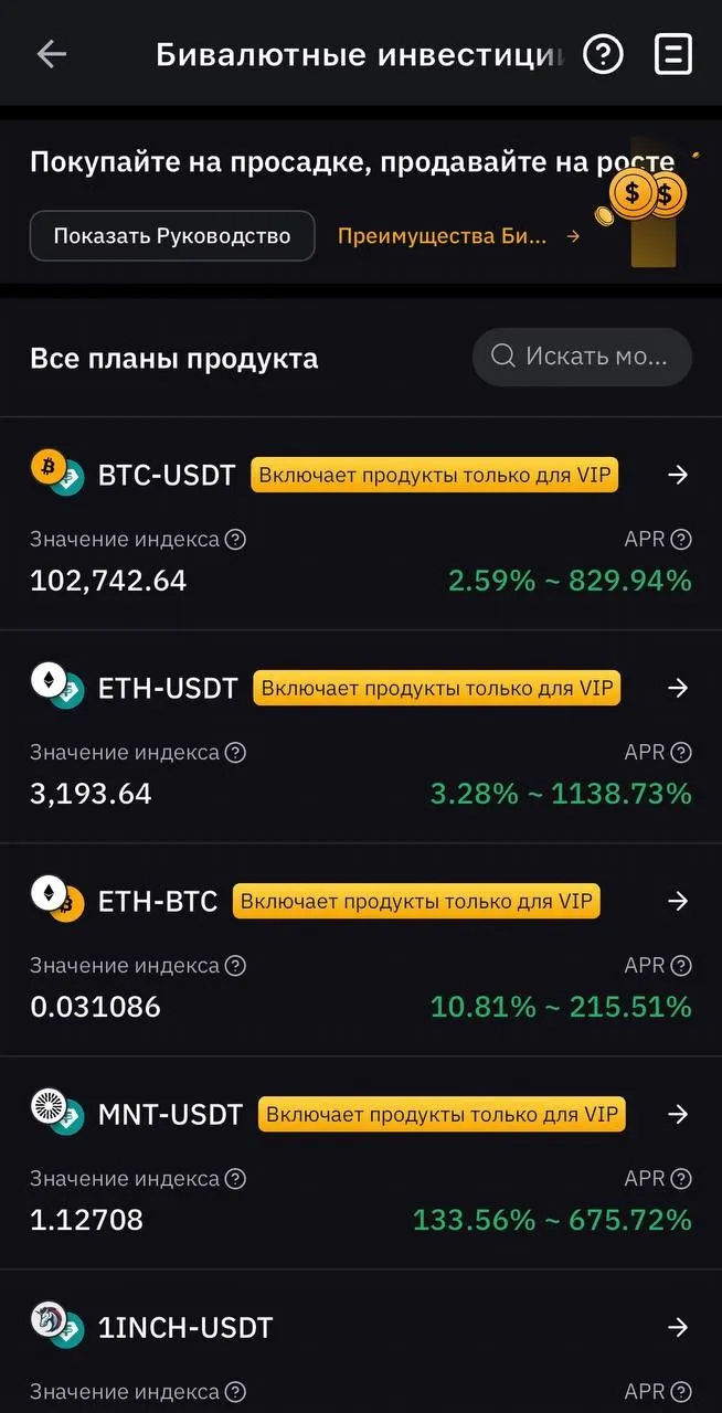 Bybit также предлагает бивалютные инвестиции, уделяя внимание простоте интерфейса и выгодным условиям: