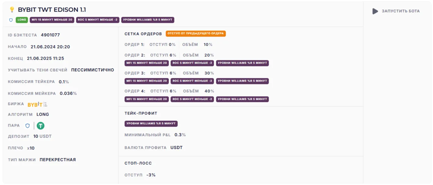 Как Эдисон не останавливался на достигнутом, так и стратегию можно улучшать. Можно попробовать сократить сетку до двух ордеров вместо четырех, чтобы фиксировать чуть больший профит на пробоях уровней W%R. Также можно подкорректировать стоп-лосс после второго ордера для защиты от глубоких просадок. Эти эксперименты помогут адаптировать стратегию под разные активы и стили торговли, сохраняя ее универсальность.