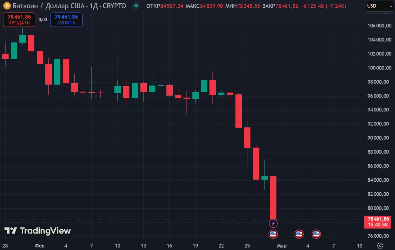 Движение биткоина, февраль 2025. Источник: Tradingview