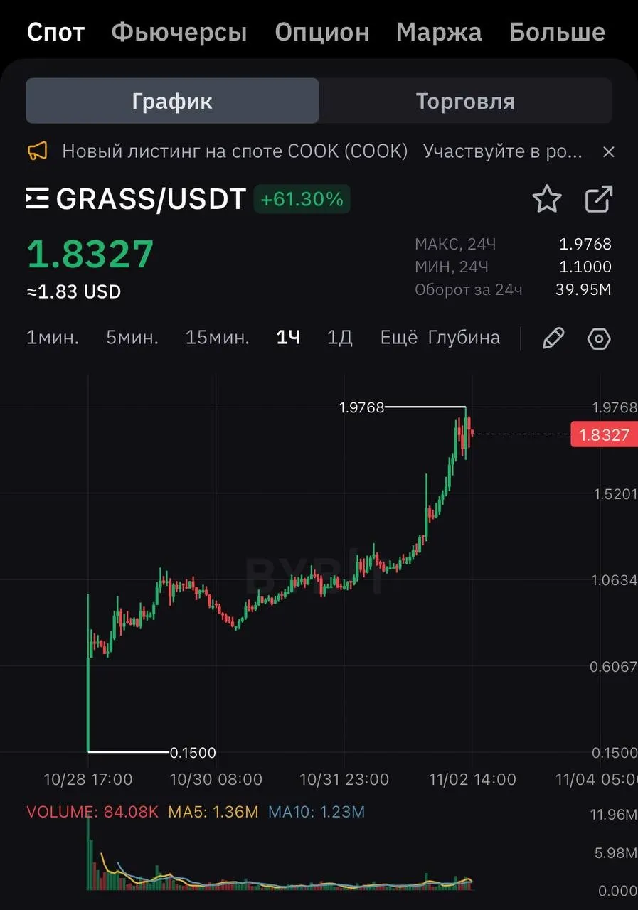Вовремя листинга цена за один токен $Grass варьировалась от 0.8 до 1$. После листинга цена в моменте опускалась до отметки 0.65$. Большое количество пользователей, получивших аирдроп, вероятно, приняли решение продать свои токены сразу на листинге, в связи с чем курс актива после листинга снижался, однако затем на протяжении нескольких дней подряд актив рос в цене. На данный момент (2 ноября 2024 года) курс уверенно держится выше сильной отметки в 1$ и торгуется в диапазоне 1.5–2$ за токен. Пиковая цена (all time high–ATH) актива за все прошедшее время составляет – 1.98$, минимум (all time low–ATL) равен – 0.65$. Волатильность монеты и объемы торгов по прежнему остаются повышенными, поэтому стоит особенно быть аккуратным при принятии торговых решений и соблюдать заложенные риски.
