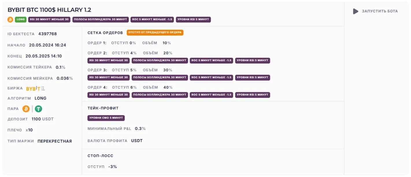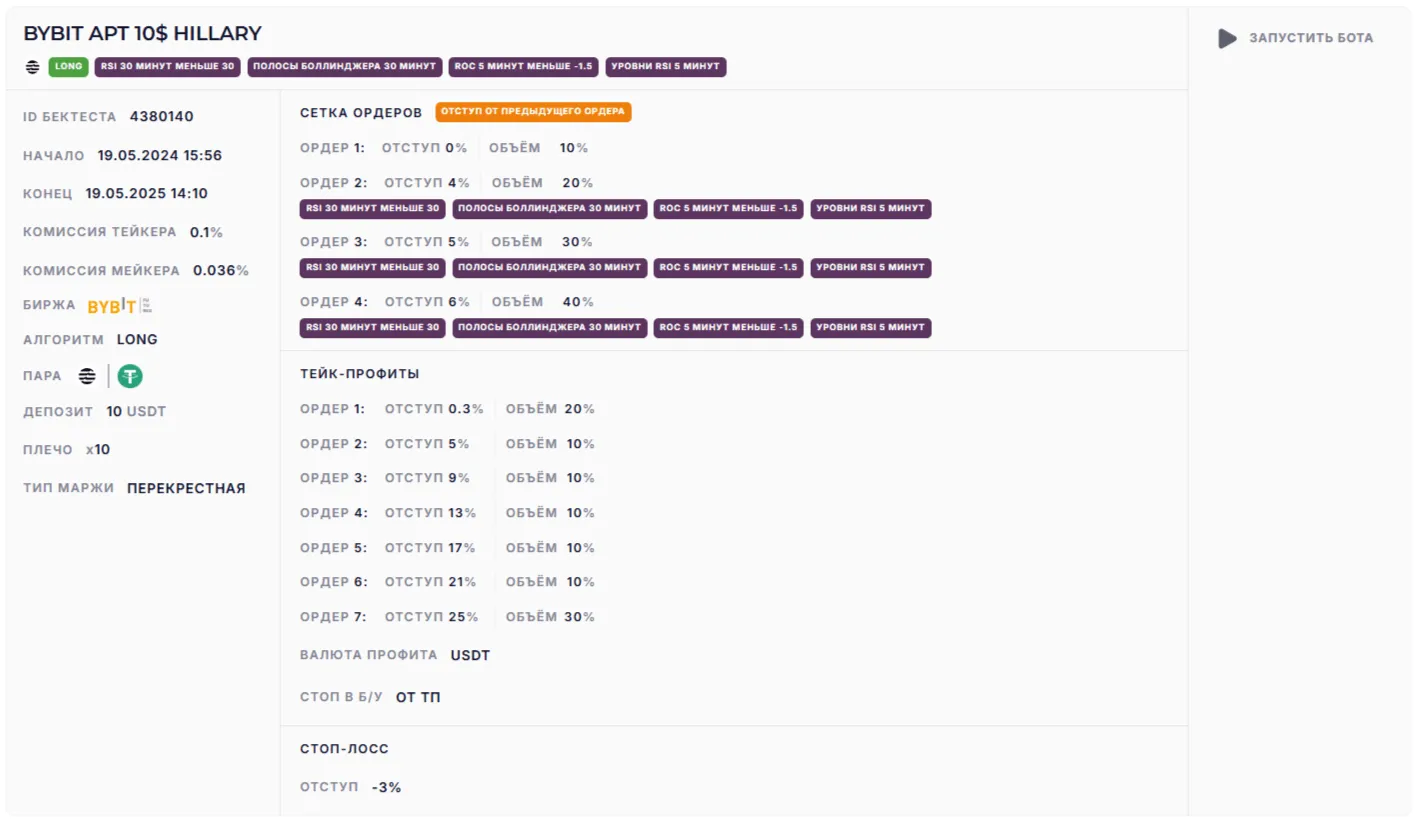 Хиллари не бросался на Эверест сломя голову — каждый шаг был просчитан. В стратегии “Хиллари” управление позициями строится на принципах мульти-тейков, где первый тейк — точка безубыточности. Сетка ордеров заимствована из спотовой стратегии ELDER, но с небольшими изменениями в расстояниях между ордерами.