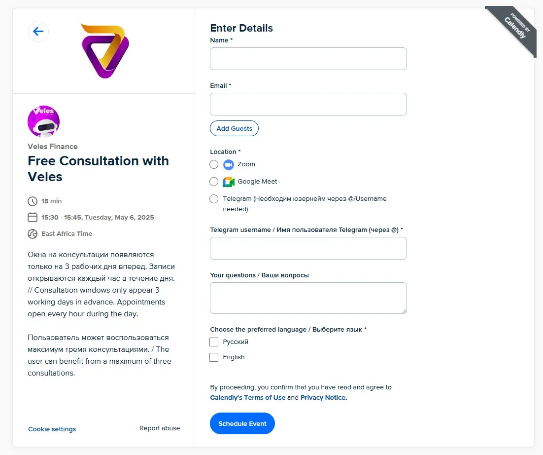 Кроме того, для пользователей, которые предпочитают более структурированный подход, доступен календарь встречи с командой Veles, где можно заранее выбрать удобное время и провести персональный звонок с сотрудником Veles. Это особенно полезно, если вопрос требует демонстрации экрана, детального разбора стратегии или консультации по функционалу платформы.