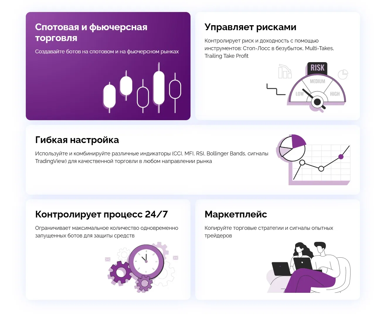 На платформе Veles доступно создание и гибкая настройка необходимых параметров как фьючерсных, так и спотовых торговых ботов, для их тестирования можно проводить бектесты или же воспользоваться уже готовыми криптовалютными ботами.