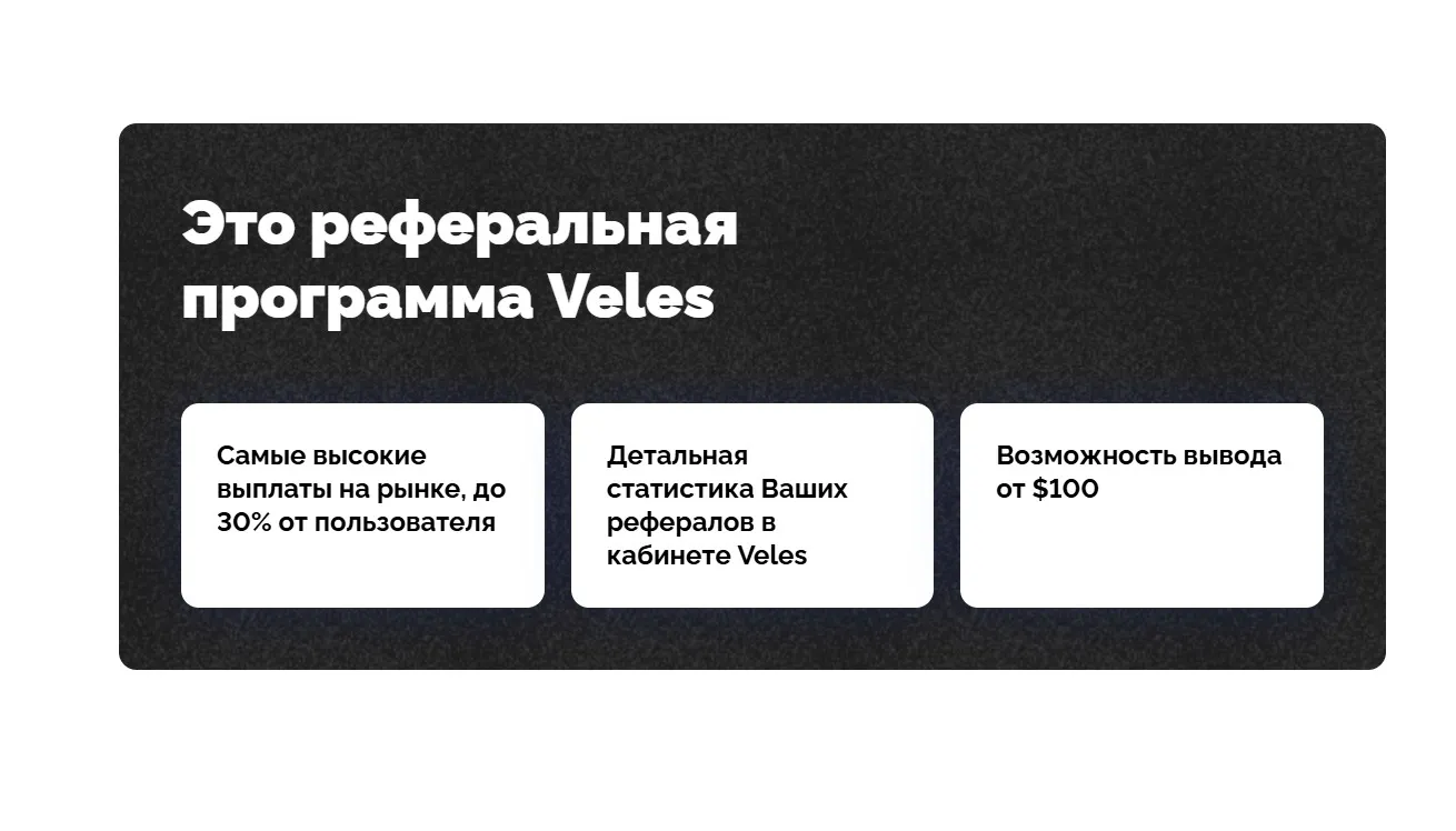 Большинство централизованных бирж, криптопроектов и других платформ предлагают партнёрские программы, где пользователи могут получать часть от комиссий и иные бонусы за привлечение новых участников. Платформа Veles Finance предоставляет реферальную программу, вы можете получать 30% заработка от привлеченных пользователей.