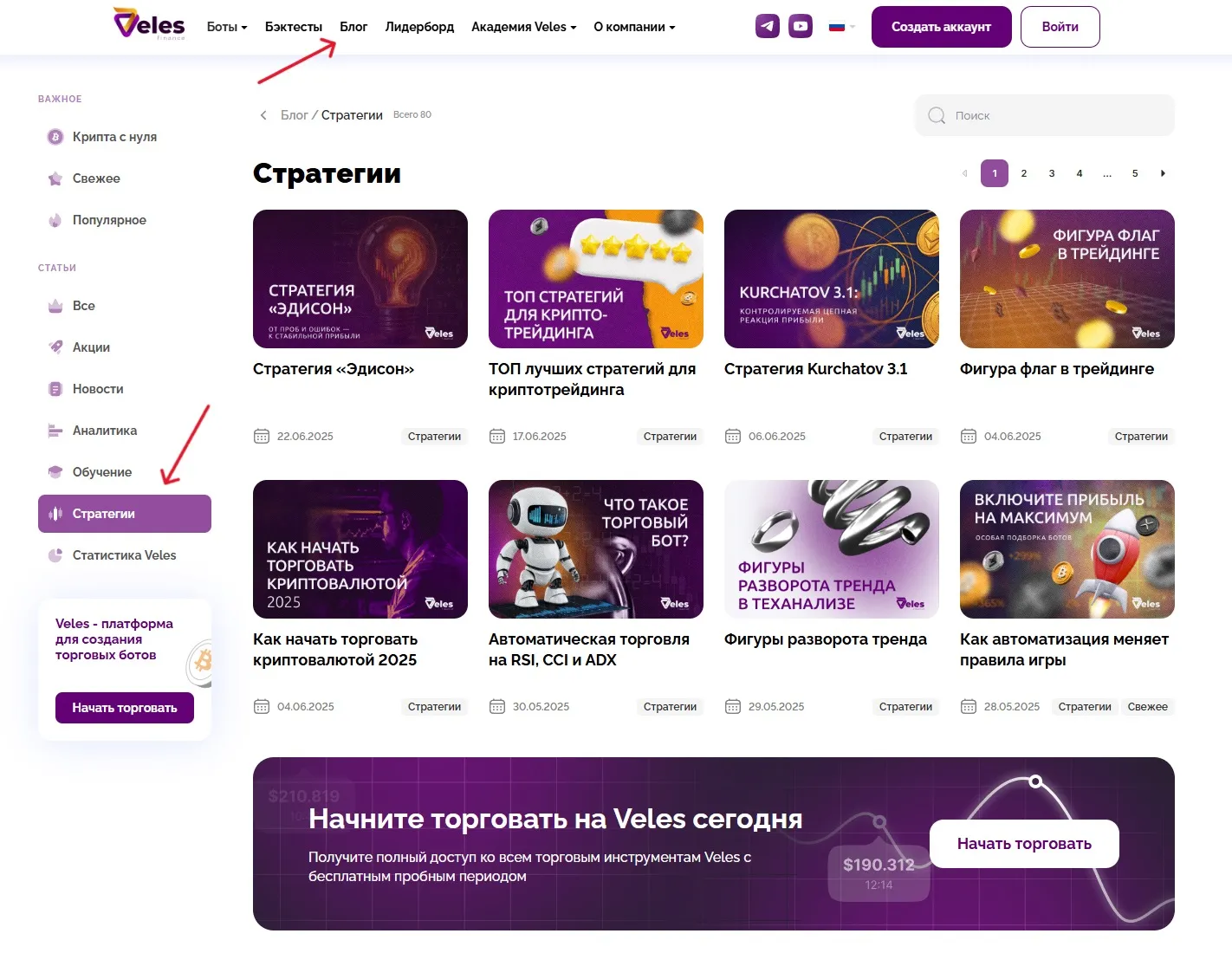 Чтобы найти авторские стратегии от Veles, достаточно перейти в официальный блог Veles в раздел «Стратегии». Здесь собраны все авторские разработки, каждая из которых подходит под конкретные рыночные условия и может быть запущена через торговый бот.