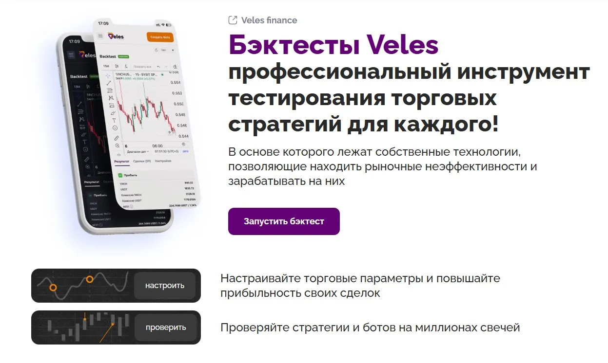 На платформе Veles процесс тестирования происходит в несколько этапов, полностью встроенных в интерфейс платформы. Чтобы запустить бэктест Veles, достаточно выбрать нужную авторскую стратегию, задать параметры — временной промежуток, биржу, торговую пару и объем сделки. Далее система автоматически рассчитает, как стратегия отработала бы на реальном рынке. При этом учитываются комиссии, проскальзывания и другие факторы, которые влияют на результат в живой торговле.
