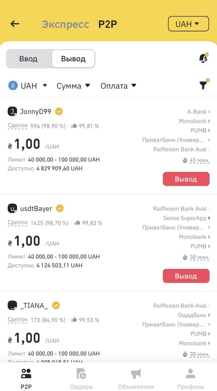 P2P позволяет не только выводить фиатную валюту, но и продавать криптовалюты другим пользователям с получением средств за пределами Binance. Однако доступных криптовалют для этих сделок немного: для большинства стран - не более пяти.