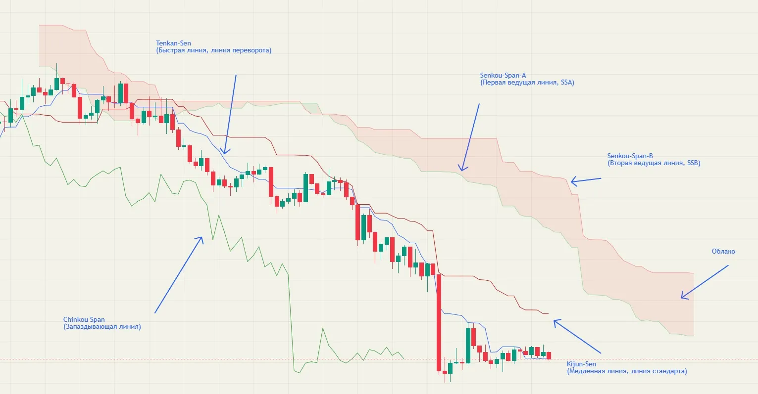 Облако Ишимоку – это японский аналитический инструмент, разработанный Гоичи Хосодой. Его главная особенность заключается в том, что он сочетает в себе несколько функций сразу, позволяя получить комплексную картину рынка из одного индикатора.