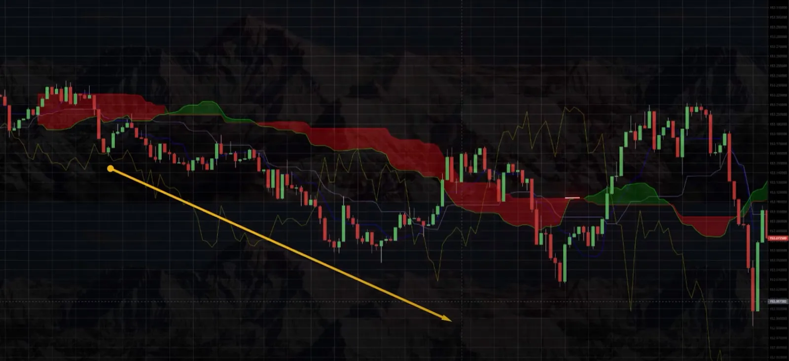 Цена ниже облака сигнализирует о нисходящей тенденции.
