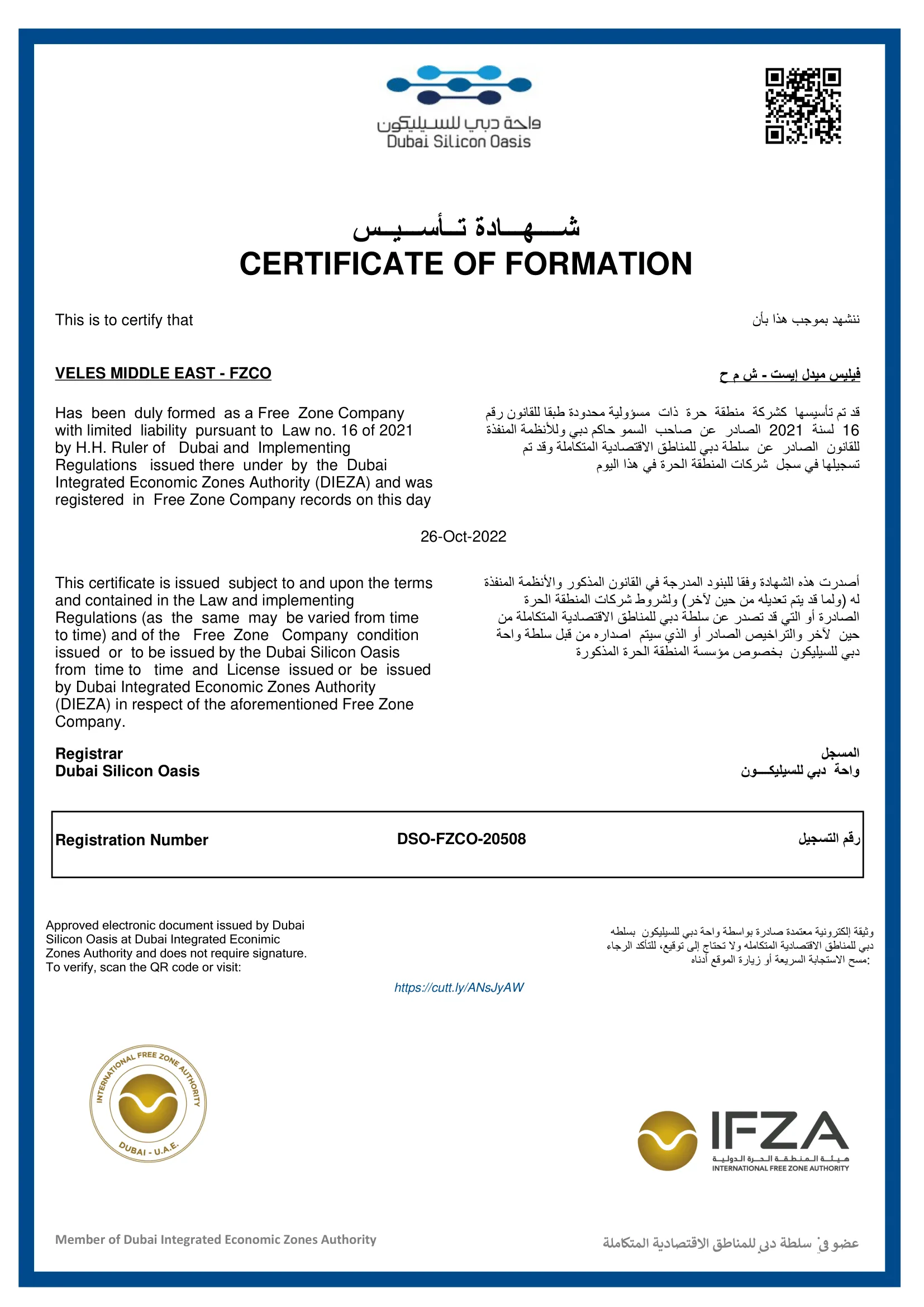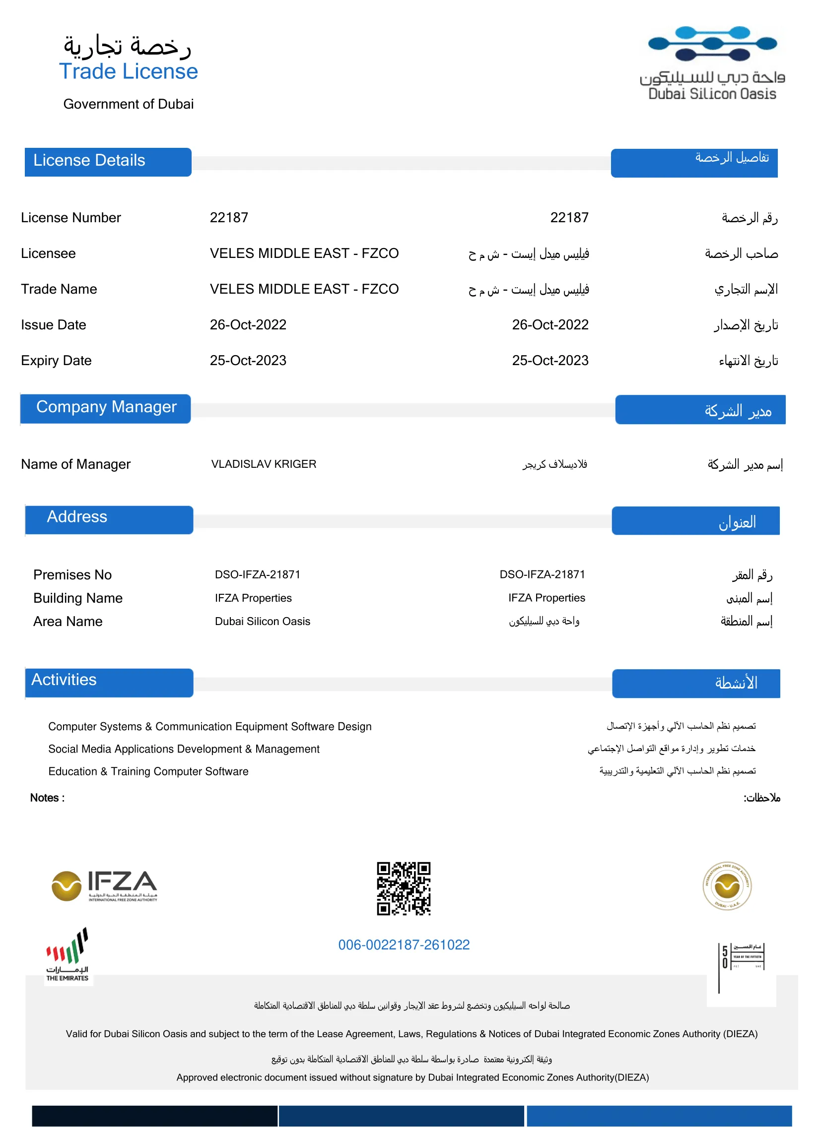 Компания VELES MIDDLE EAST – FZCO зарегистрирована в Дубае. Номер лицензии 22187 от 26.10.22. Юридический адрес: Building A2 IFZA Business Park — Dubai Silicon Oasis — Dubai — United Arab Emirates