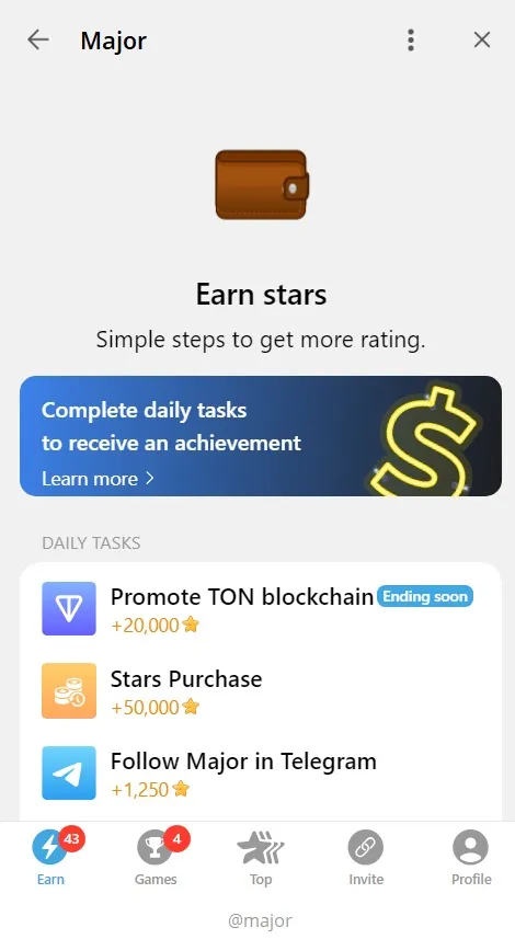 Major представляет собой мини-приложение в мессенджере Telegram, стартовавшее 3 июля 2024 года, где пользователи могут зарабатывать внутриигровую валюту, которую в будущем можно будет обменять на токены проекта. Ключевые функции игры связаны с накоплением stars⭐️, которые можно заработать за приглашение друзей (рефералов), подписки на социальные сети проекта, выполнение заданий в игровом центре и за транзакции в блокчейне TON.