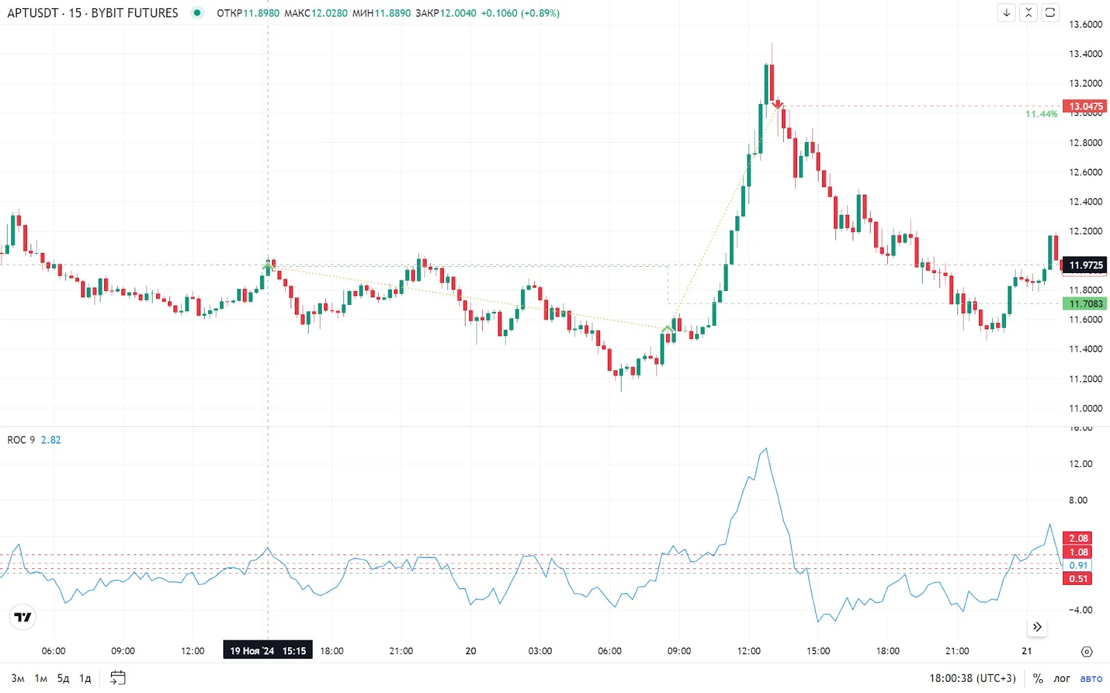 Положительное значение ROC (выше нуля) указывает на то, что текущая цена закрытия актива выше цены закрытия ( n ) периодов назад. Это сигнализирует о восходящем тренде и может быть сигналом к покупке.