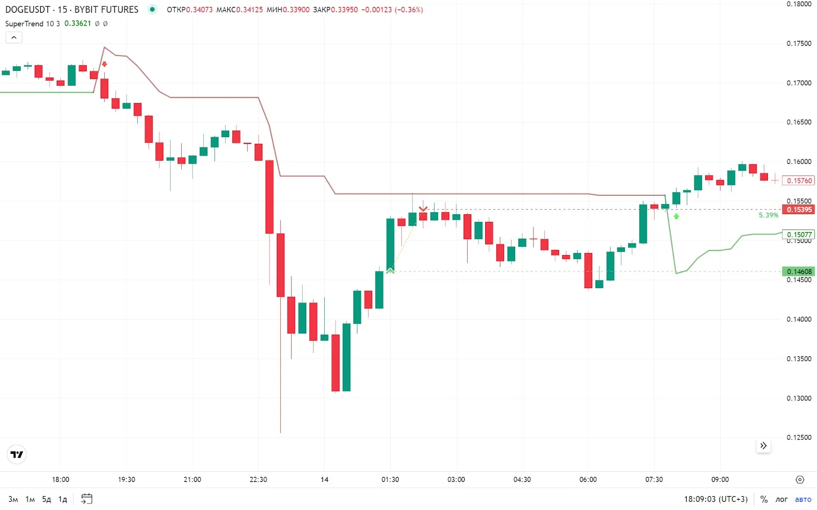 Выставим индикатор Supertrend (“тренд”, обратный сигнал) на таймфрейм m15.