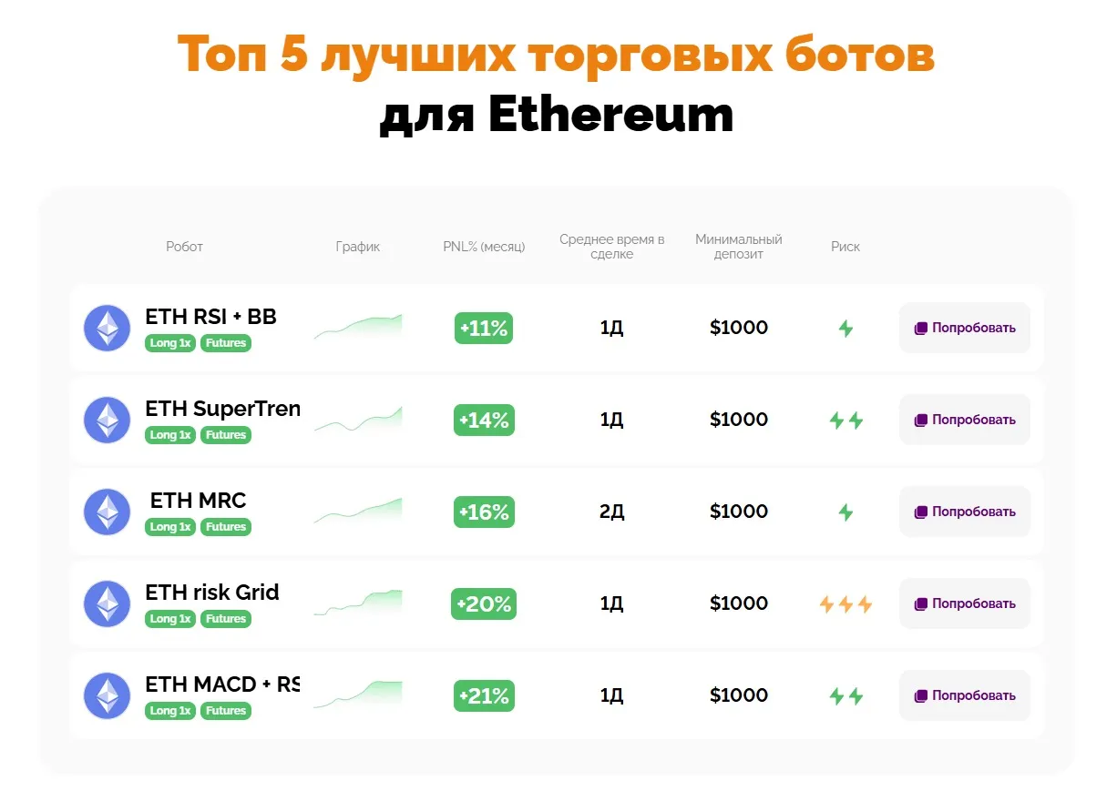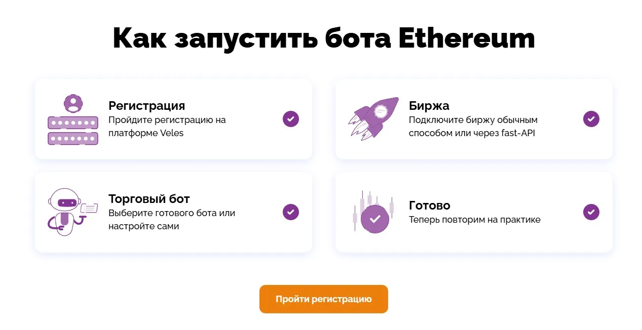 Если вы только начали изучать алгоритмическую торговлю, то выбирайте ETH bot, обладающего простым интерфейсом, функцией тестирования бота, шаблонами настроек и поддержкой через API-ключи. Хорошим выбором будут решения от Veles, предоставляющие инструкции по настройке бота и возможности запуска их без знаний кода.