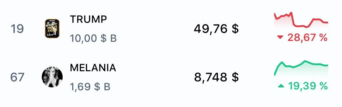TRUMP и MELANIA вошли в топ крупнейших криптовалют после запуска